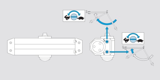- Regulowana siła zamykania EN 2/3/4 poprzez przestawny montaż samozamykacza względem zawiasów