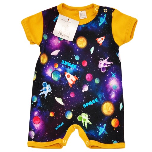 Musztardowy rampers dziecięcy z krótkim rękawem na lato z nadrukiem kosmosu.