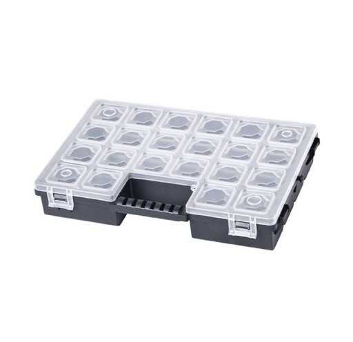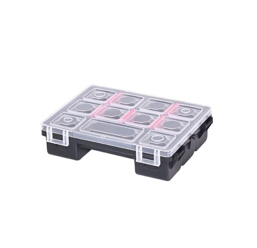 Solidny organizer Domino 25 czarny na mniejsze części jak np. gwoździe, wkręty, śruby i inne nieduże elementy. Starannie wykonany ze wzmocnionego tworzywa sztucznego, które wraz z wykonaną z poliwęglanową przezroczystą pokrywą zapewnią bezpieczeństwo przenoszonym wewnątrz przedmiotom. Wyposażony jest w 12 komór ułatwiających utrzymanie porządku.