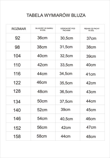 Wymiary dla bluzy poszczególnych rozmiarów kompletów dresowych podajemy w tabeli poniżej: