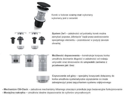 Uniwersalny Korek umywalkowo-bidetowy Click-Clack z funkcją czyszczenia od góry – spełni oczekiwania nawet najbardziej wymagających użytkowników. Korki umywalkowo-bidetowe zostały zaprojektowane tak, aby sprawdzały się zarówno podczas montażu jak i długoletniego użytkowania.