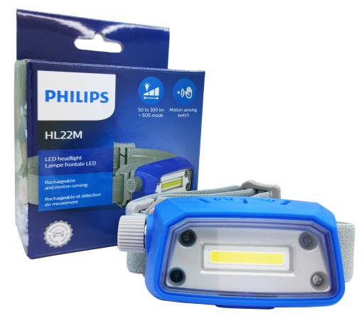 Lampa czołowa Philips HL22M jest wyposażona w tryb czujnika ruchu umożliwiający bezdotykową obsługę urządzenia. Oznacza to, że można kontrolować lampę, machając dłonią przed czujnikiem. Aby włączyć tryb czujnika ruchu, należy włączyć lampę, nacisnąć i przytrzymać przycisk wykrywania ruchu, aż zaświeci się niebieska kontrolka w lewym górnym rogu. Od tego momentu możliwe jest sterowanie pracą lampy bez dotykania jej.