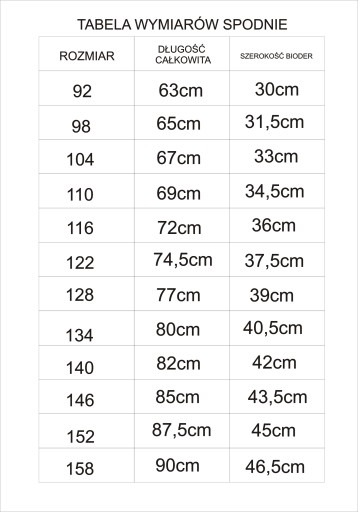 Wymiary dla bluzy poszczególnych rozmiarów kompletów dresowych podajemy w tabeli poniżej: