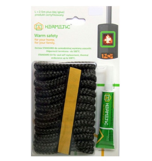 Skład zestawu: Szklany sznur Ø 12mm o długości 2,5m, klej ceramiczny temperaturowy 20ml, taśma zakończeniowa