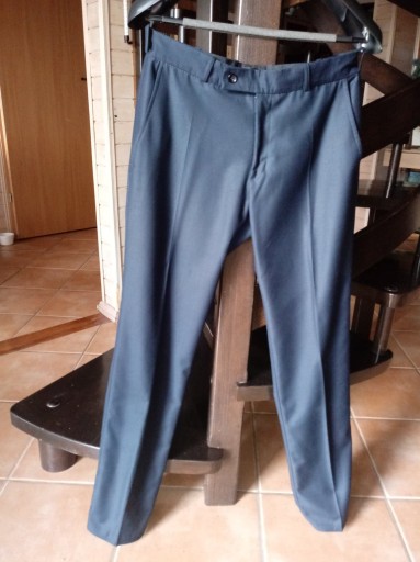 Garnitur granatowy 40, 176cm na szczupłego mężczyznę. Założony dwa razy, jest w bardzo dobrym stanie. Z tyłu marynarka posiada dwa rozcięcia i trzy kieszenie na zewnątrz i trzy w środku.Spodnie, pas- 41cm. nogawka na dole- 19cm.