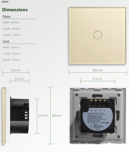 Produkt wysokiej jakości, renomowanej firmy BSEED. Panel przedni w kolorze złotym a obramówka w kolorze białym. Metalowa ramka łączy wszystkie elementy w całość co potwierdza jakość wykorzystanych elementów konstrukcji włącznika.