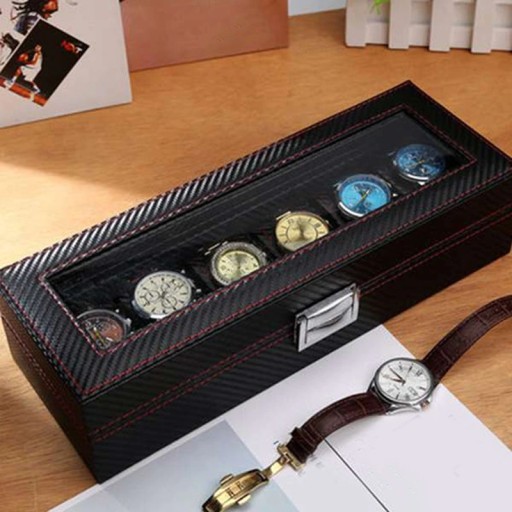 Solidne, eleganckie pudełko na 6 zegarków. Wykończone materiałem przypominającym karbon, oraz elegancką czerwoną nicią. Można w nim przechowywać zegarki lub po wyjęciu poduszeczki biżuterię lub inne drobiazgi.
