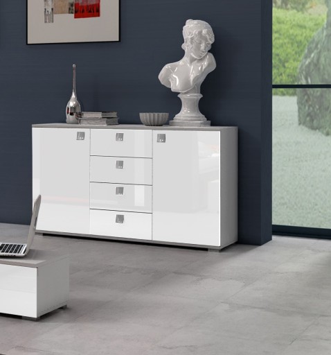 ⭐ KOMODA- Nowoczesna komoda o prostym wyglądzie, posiada dwoje drzwiczek oraz cztery szuflady na środku. Front wykonany z płyty na wysoki połysk w kolorze białym, korpus biały matowy. Mebel idealnie sprawdzi się zarówno w klasycznych, jak i nowoczesnych wnętrzach. Dzięki pojemnym szufladom ułatwi zachowanie porządku w pomieszczeniu oraz zaoszczędzenie miejsca w pozostałych meblach. Ponadto posiada praktyczne i ozdobne uchwyty w kolorze srebrnym, które nadają eleganckiego stylu.
