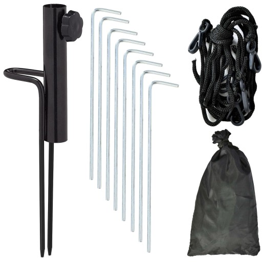 Zawiera szpilki i sznurki do wzmocnienia parasola. Wszystko spakowane w mały pokrowiec. Dodatkowo w komplecie wbijak.