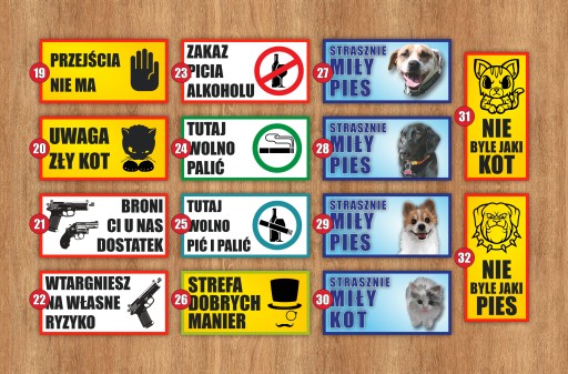 A jak Państwu nie chce się grzebać w czeluściach Allegro to poniżej mamy wykaz wszystkich tabliczek informacyjnych, ostrzegawczych czy wręcz śmiesznych. Wystarczy kupić obojętnie którą i w informacji napisać numer. ZAPRASZAMY RÓWNIEŻ NA INNE NASZE AUKCJE.