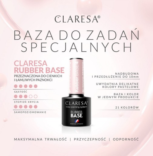 Bazę kauczukową CLARESA można zastosować jak standardową bazę pod hybrydę, nadbudować nią uszkodzony paznokieć, wyrównać wszelkie nierówności płytki oraz wyrównać koloryt.