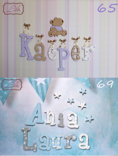 Dekor do wyboru : autko, samolot, latawiec, ślimak, kotwica, statek, kwiatek, korona, serduszko, motylek, żabka, biedronka, słoń, uszy z kokardą, pająk, gwiazdka (pełna). Pozostałe dekoracje pokazane na przykładach można zakupić na pozostałych naszych ofertach. Kolorystykę dekoru zawsze dobieramy do wzoru literek.