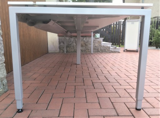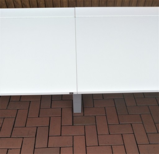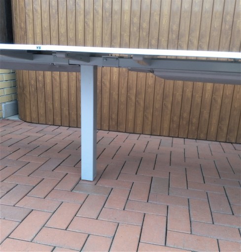 Biurko niemieckiej firmy VS to połączenie prostego designu i wysokiej jakości materiałów. Blat składa się z trzech elementów - głównej płyty i dwóch mniejszych, otwieranych. Zastosowane rozwiązanie umożliwia wygodne ułożenie przewodów. Specjalna maskownica w formie szczotek pozwala na wyciągnięcie kabli w dowolnym miejscu. Pod blatem znajduje się materiałowy uchwyt, dzięki czemu zachowanie porządku jest znacznie łatwiejsze. Biurko wyposażone zostało w nogi wkręcane w metalowy stelaż, aby zapewnić pełną stabilność mebla. Połączenie dwóch biurek specjalną nogą umożliwiającą wygodną pracę.