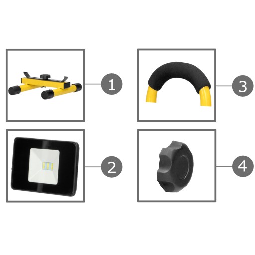 - Wyposażony jest w diody LED SMD, hermetyczny przycisk, mocny uchwyt do przenoszenia, praktyczną obrotową, odkręcaną podstawkę z regulacją w poziomie 360° oraz w pionie (góra-dół).