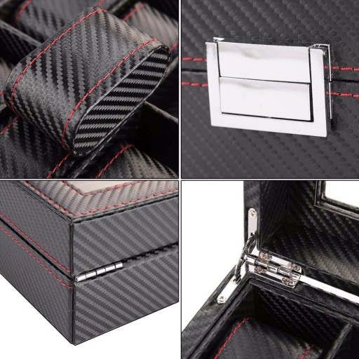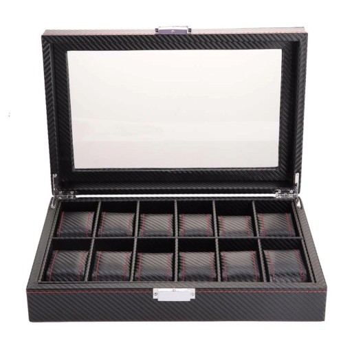 Solidne, eleganckie pudełko na 12 zegarków. Wykończone materiałem przypominającym karbon, oraz elegancką czerwoną nicią. Można w nim przechowywać zegarki lub po wyjęciu poduszeczki biżuterię lub inne drobiazgi.