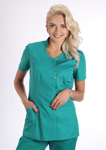 Bluza rozpinana na napy marki Schaeffer. Trzy pierwsze ozdobne, pozostałe kryte .W przodach modelujące sylwetkę cięcia francuskie. Mała stójka i wycięcie w serek, tworzą ciekawy dekolt. Możliwość zestawienia w komplecie ze spodniami . Krótki rękaw, dwie kieszenie na wysokości bioder (w tym miejscu proponujemy umieszczenie logo firmy, bądź personifikacji z flocka - w tym celu konieczny jest kontakt z producentem).