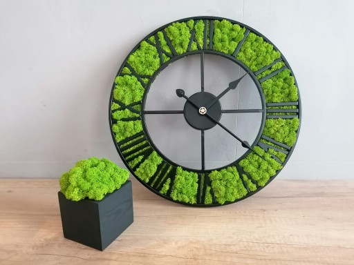 Połączyliśmy metalowy zegar z mchem chrobotkiem fińskim jakości PREMIUM, który go pięknie dopełnia. Dodaj zieleń do swojego domu !