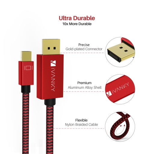 - Kabel iVANKY Mini-DisplayPort na DisplayPort umożliwia przesyłanie wysokiej jakości filmów i treści z tabletu, laptopa lub komputera stacjonarnego z złączem Mini DisplayPort na dowolny monitor z DisplayPort. Dzięki konstrukcji zatrzasku bez zwalniania łatwiej jest go podłączyć i odłączyć na monitorze.