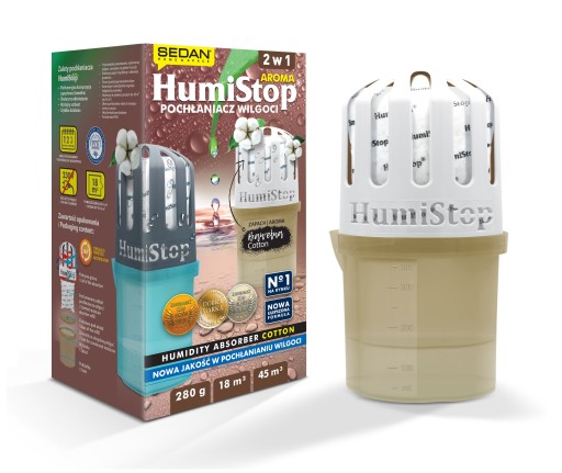 Nowy pochłaniacz wilgoci HumiStop® Aroma to wysokiej jakości urządzenie, które doskonale radzi sobie z nadmiarem wilgoci w pomieszczeniach do 18 m² oraz dodatkowo nadaje dyskretny, lecz wyczuwalny zapach bawełny. Kontroluje i samodzielnie reguluje nadmiar wilgoci w pomieszczeniach.
