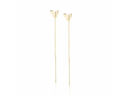 Eleganckie, wykonane z pozłacanego srebra przewlekane wiszące kolczyki z ozdobą o kształcie przypominającym polerowanego na wysoki połysk motylka.
