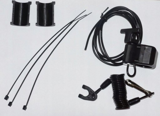 3.Elastyczny przewód wychodzący z zabezpieczenia (wsuwki ) mocujemy do elementów naszego stroju lub specjalnej opaski na nadgarstku. W momencie gdy "opuścimy" pojazd nastąpi wypięcie zabezpieczenia i wyłączenie silnika.