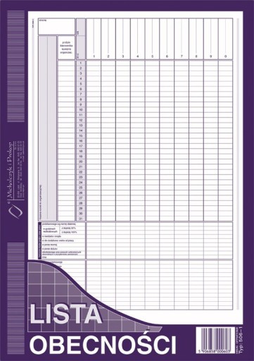 Druk stanowiący listę obecności w formacie A4. Wzór listy wykonany z papieru offsetowego. Druk dwustronny, 40 kartkowy.