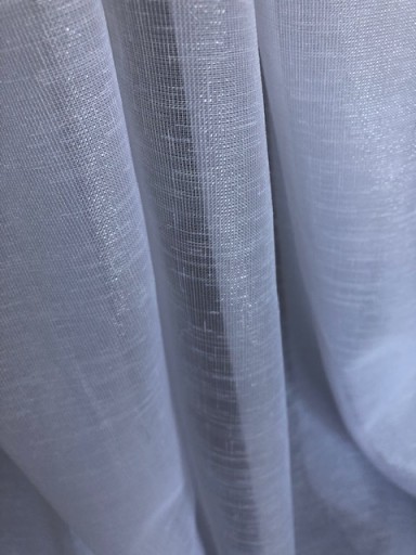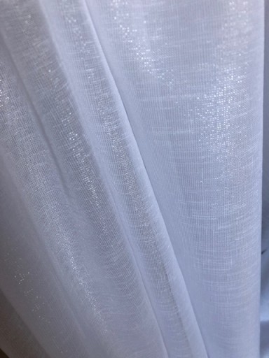 Nowoczesna, elegancka firana z tkaniny cechującej się dużą odpornością na zagniecenia, z modnym, delikatnym wzorem imitującym splot lnu. Nazywana białym szronem lub batystem mrożonym. Niepowtarzalnego uroku nadaje nabłyszczenie tkaniny, powodujące subtelne mienienie się w świetle.