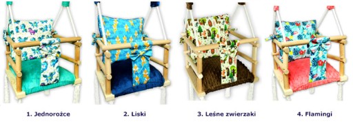 W ofercie posiadamy huśtawkę Maliva w czterech przepięknych wzorach: jednorożce, liski, leśne zwierzaki oraz flamingi: