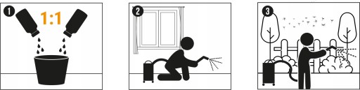 Na zewnątrz: przygotować roztwór i rozprowadzać go na zewnętrznych ścianach budynków, chodnikach, pod krzewami i żywopłotami, itp.