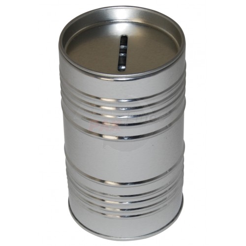 Skarbonka w postaci beczki na olej ze zdejmowaną pokrywą. Z kolekcji Niemieckiej. Wykonana z blachy ocynkowanej elektrolitycznej. Błyszcząca powierzchnia metalowa.