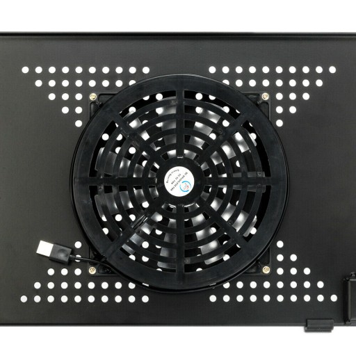 Zamontowany duży wiatrak zasilany z portu USB w razie konieczności bardzo dobrze chłodzi postawiony na stoliku laptop pracując cicho i wydajnie.