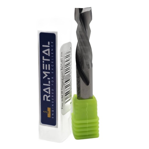 - Frez 2 ostrzowy o geometrii podwójnej - połączonej spirali tzw. compression zapewnia bardzo wydajną obróbkę z zachowaniem czystej krawędzi górnej i dolnej materiału,