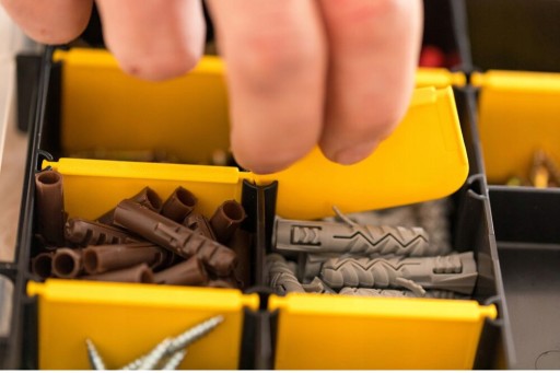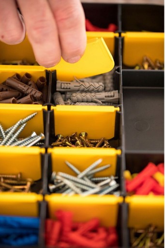 - Okrągłe krawędzie przegródek ułatwiają wyjmowanie małych części, które mogą być trudne do wyjęcia