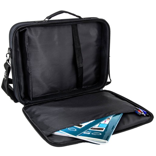 Wewnątrz znajduje się kieszeń na podręczne dokumenty oraz pasek dodatkowo przytrzymujący notebook.