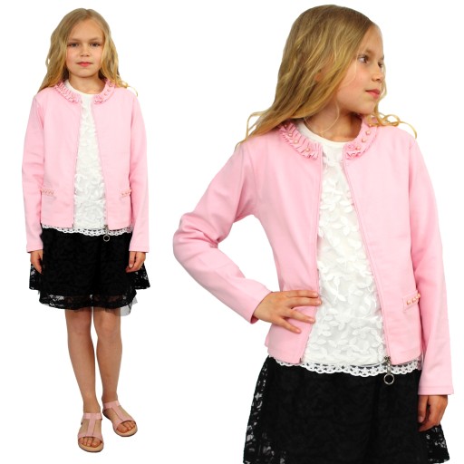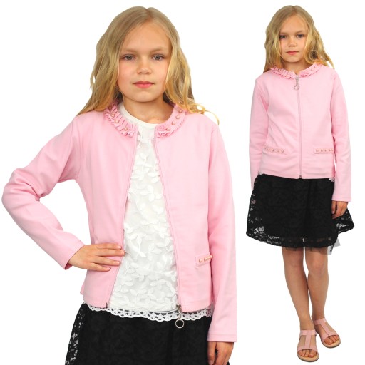 - kołnierzyk dookoła przeszyty fantazyjną dzianinową tasiemką, z przodu dodatkowo ozdobiony różowymi perełkami