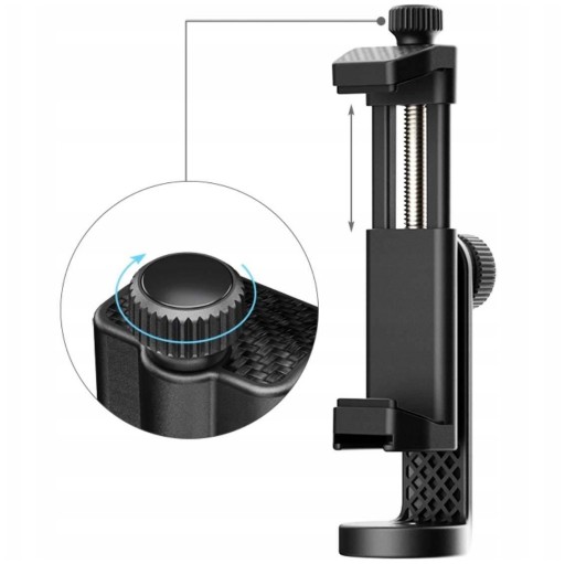 Uchwyt trzymający telefon rozszerza się za pomocą śruby z pokrętłem.