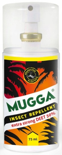 MUGGA w sprayu dla osób dorosłych oraz dzieci od 12 roku życia, o silnym, odstraszającym działaniu przeciwko komarom (europejskim i tropikalnym), muchom, muchom krwiopijnym, meszkom, moskitom, gzom, bąkom, kleszczom i innym insektom. Zabezpiecza przed ukąszeniem przez 6-8 godzin od zastosowania. Ma przyjemny zapach, można je bezpiecznie stosować na preparaty do opalania i inne kosmetyki.