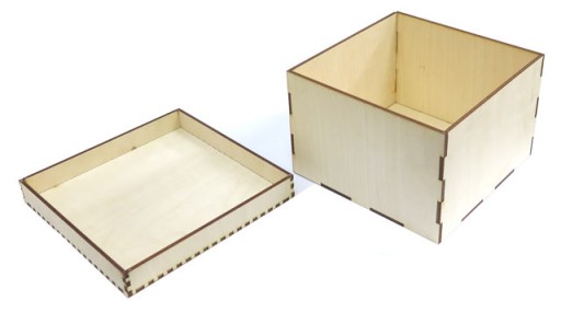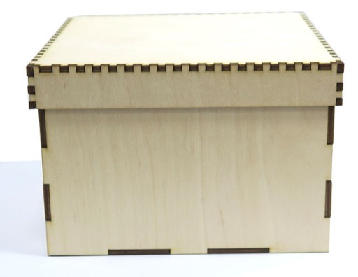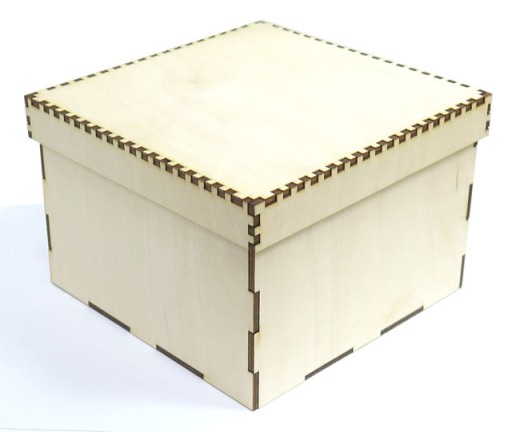 Pudełko ze sklejki o grubości 3mm z przykrywką o zewnętrznych wymiarach: 150x150x100mm, wymiary zewnętrzne przykrywki: 157x157x22mm