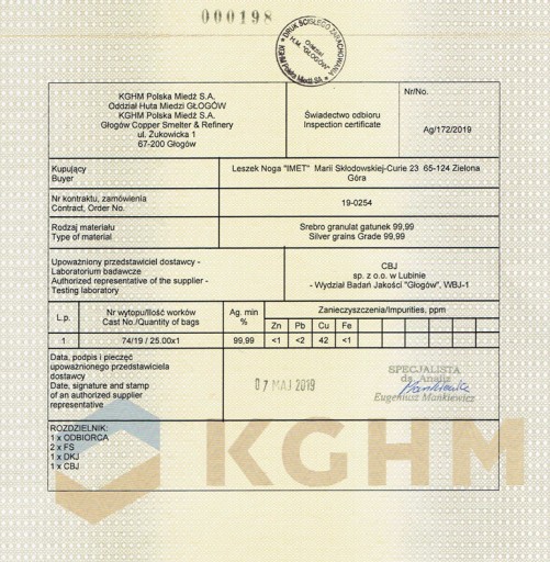 Jakość srebra potwierdzona jest przez upoważnionego przedstawiciela dostawcy - Laboratorium Badawcze CBJ Wydział Badań Jakości "Głogów" WBJ-1