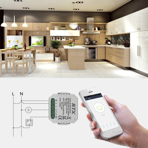 Moduł przekaźnika instaluje się w puszce pod tradycyjnym włącznikiem światła. Po podłączeniu zgodnym ze schematem będzie można sterować zapalaniem światła zdalnie z aplikacji, tradycyjnie włącznikiem lub w sposób zautomatyzowany według wcześniej zaprogramowanych scenariuszy.