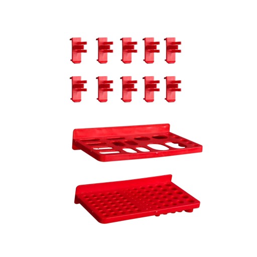 Przedstawiony obok zestaw to kompletna tablica na narzędzia ze wszystkimi uchwytami i kuwetami widocznymi na zdjęciach. (Bez samych narzędzi.)