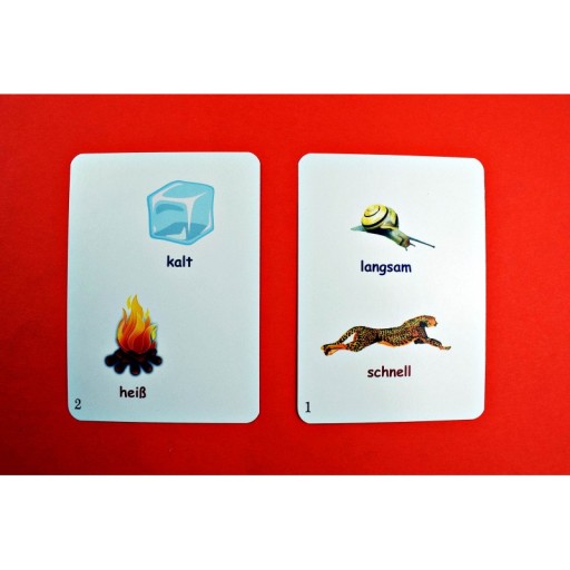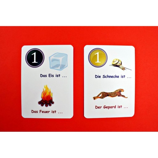 Zestaw zawiera 200 kart obrazkowych zawierających 600 podstawowych słów. Doskonała zabawa oraz idealna pomoc dla osób zaczynających swoją przygodę z językiem niemieckim. Dla uczniów na nieco wyższym poziomie możemy ustalić dodatkowe zadanie, np. ułożenie zdania (lub zadanie pytania kolejnemu graczowi) z danym słowem z użyciem czasu, który akurat chcemy przećwiczyć. Zestaw składa się z 400 rzeczowników, 100 czasowników, oraz 100 przymiotników.