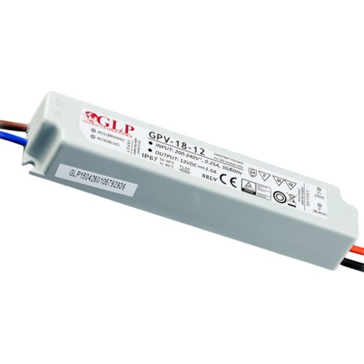 Zasilacz wodoodporny stałonapięciowy impulsowy IP67 GPV-18-12 marki GLP, największej polskiej firmy MPL, o parametrach: