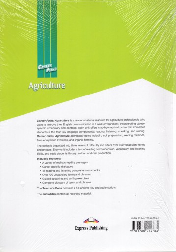 Agriculture z serii Career Paths to publikacja przeznaczona dla osób przygotowujących się do pracy lub zawodowo zajmujących się rolnictwem, pragnących doskonalić znajomość języka angielskiego w aspekcie związanym z pracą zawodową.
