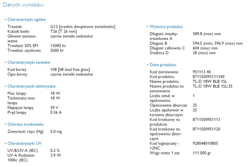 Charakterystyka Blacklight Blue Moc 18 W Napięcie 59 V Prąd 0,36 A Reflektor Nie Trzonek G13 Bańka T26 Pozycja pracy Uniwersalna Promieniowanie UV UV-A 3,9 W Wymiary Długość całkowita 604 mm Średnica 28 mm