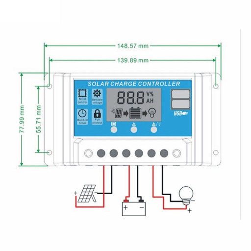 Solarny regulator i kontroler ładowania do paneli fotowoltaicznych 12/24V z wyświetlaczem LCD i portami USB.