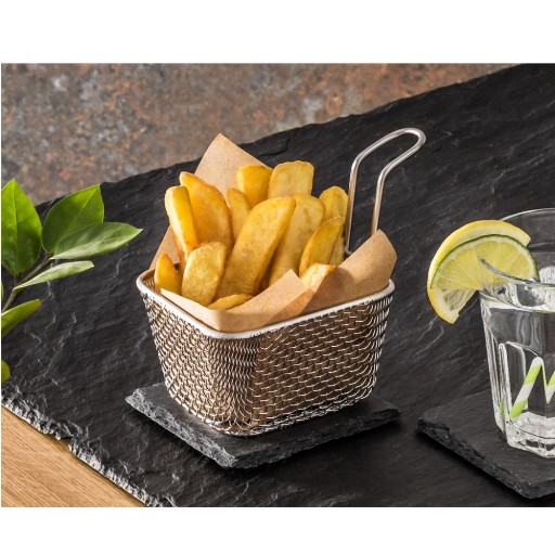 Koszyczek finger food marki Forgast do serwowania potraw. Wykonany ze stali nierdzewnej. Idealny do serwowania drobnych przekąsek: frytek, pieczonych ziemniaczków, krążków cebulowych, krewetek i in. Wygodny do trzymania uchwyt. Wykonanie ze stali nierdzewnej gwarantuje bezpieczny kontakt z żywnością i łatwe utrzymanie w czystości.