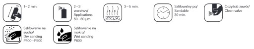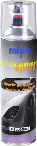 Mipa Quick-Primer Spray został opracowany specjalnie z myślą o drobnych naprawach, m.in. punktowych i przeszlifowanych powierzchni podkładów. Ten znakomity jednoskładnikowy podkład charakteryzuje się bardzo płynną rozlewnością i nie wymaga dalszego szlifowania pośredniego w obszarze strefy mgiełki lakierniczej. Mipa Quick-Primer Spray może być lakierowany bezpośrednio na mokro i posiada doskonałą przyczepność do żelaza, stali, ocynku, aluminium i większości tworzyw sztucznych stosowanych w przemyśle motoryzacyjnym (PU, ABS, PC i PS; w razie potrzeby dokonać natrysku testowego). Wysoka ochrona antykorozyjna.