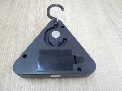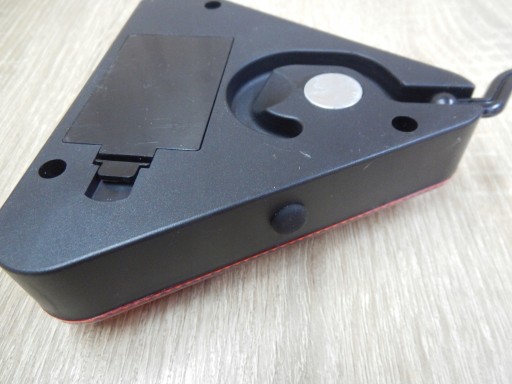 Aby zainstalować baterie należy otworzyć klapkę znajdującą się w tylnej części trójkąta i umieścić je wewnątrz zachowując właściwa biegunowość.