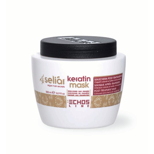 Maska EchosLine Seliar Keratin do włosów prostowanych, farbowanych lub po trwałej . Idealna do utrwalenia efektu tych zabiegów. Formuła pozbawiona parabenów, SLS, SLES oraz chlorku sodu łagodnie oczyszcza włosy, nie naruszając przy tym łuski włosa. Formuła wzbogacona keratyną i olejkiem arganowym, lnianym zapewnia kompletną pielęgnację. Filtr UV chroni włosy po prostowaniu, trwałej i innych zabiegach z użyciem składników utleniających, sprawia, że włosy stają się miękkie, pełne blasku I witalności. Wzmacnia włókna włosa , chroni kolor oraz uszczelnia łuski, dzięki czemu zapobiega utracie pigmentów oraz cennych protein. Eliminuje problem puszenia się i elektryzowania włosów. Zabezpiecza włosy przed szkodliwymi czynnikami zewnętrznymi i uszkodzeniami mechanicznymi.